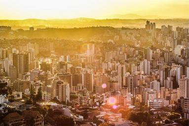 Keywords: sunset sun rays skyline buildings city architecture towers high rises aerial urban downtown sky