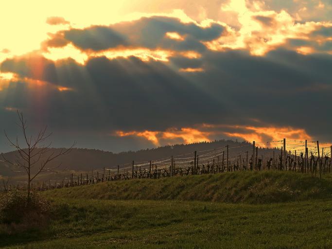 Keywords: sunset sun vineyard wingert afterglow klingenmünster palatinate southern wine route sky clouds evening sky abendstimmung romantic setting sun romance