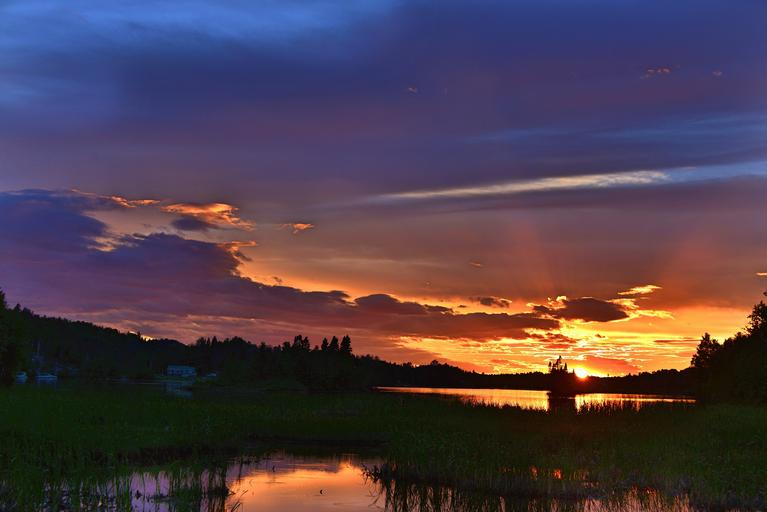 Keywords: sunset twilight sun clouds lake lying water québec canada