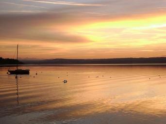 Keywords: sunset water boat dusk twilight evening sky colorful scenic peaceful outdoors silhouette shore