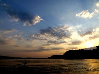 Keywords: sunset water fisherman reflection sun twilight in the evening shadow red sky