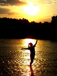 Keywords: sunset water girl shadow reflection sun twilight in the evening red sky