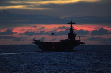 Keywords: sunset water ocean silhouette dusk sky aircraft carrier outdoors seascape military navy ship vessel horizon clouds