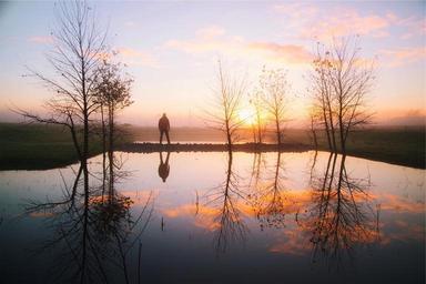 Keywords: sunset water reflection trees pond guy man jacket fog rural clouds