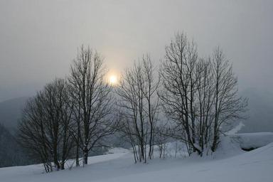 Keywords: sunset winter tree cold snow fog mountain
