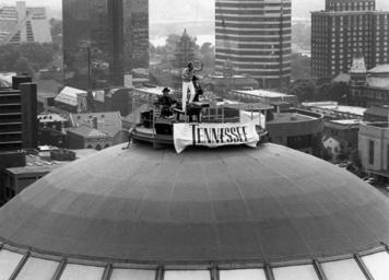 Keywords: SunsphereJasonWilliams.jpg en Jason D Williams performs atop Knoxville's Sunsphere a 266-foot monument built for the city's 1982 World's Fair George Spencer George Spencer 1990-05-31 Cc-zero Sunsphere Knoxville skylines