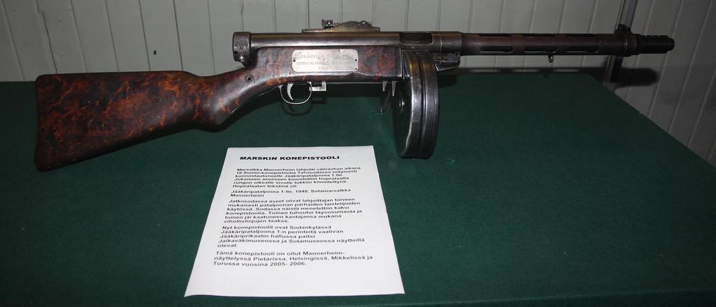 | Keywords: Suomi M31 Marskin konepistooli.JPG  Carl Gustaf Emil Mannerheim donated 10 Suomi submachine guns fitted with silver plaques to jaeger battalion 1 Two of the guns were lost during Continuation War Photographed in Mikkeli infantry museum fi Suomi m/31 konepistooli yksi Marskin konepistooleista Marsalkka Mannerheim lahjoitti 10 Suomi-konepistoolia jääkäripataljoona 1 lle Jokaiseen aseeseen kiinnitettiin hopealaatta ja kaksi aseista menetettiin jatkosodassa Kuvattu Jalkaväkimuseossa own MKFI 2011-07-13 61 40 56 76 N 27 15 45 36 E region FI Suomi M31 Mikkeli Infantry museum Taken with Canon EOS 60D Taken with Canon EF-S 15-85mm F3 5-5 6 IS USM Files by User MKFI |