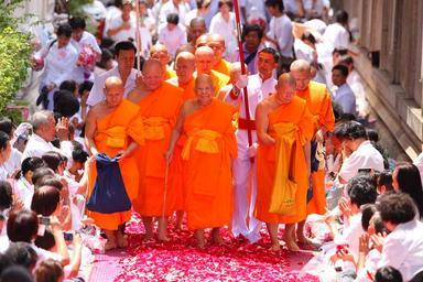 Keywords: supreme patriarch buddhists patriarch priests monk orange robes walk rose petals thailand asia thai religion belief buddhism