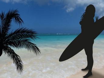 Keywords: surfer sun sea beach sand clouds sky blue turquoise paradise holiday recovery rest palm victory sign graphic