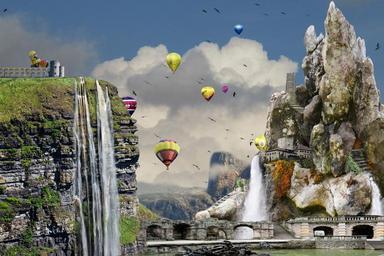 Keywords: surreal composition dream castle fly balloon waterfall fantasy bird