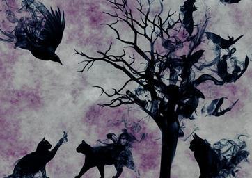 Keywords: surreal scene atmosphere mystical secret magic gloomy fantasy cat silhouette