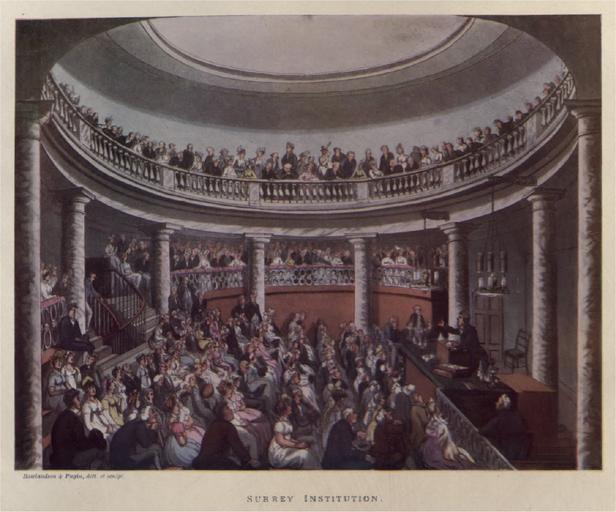| Keywords: Surrey Institution.jpg Lecture Hall of the Surrey Institution This engraving was published as Plate 81 of Microcosm of London 1810 see File Microcosm of London Plate 081 - Surrey Institution jpg The Microcosm of London or London in Miniature volume III by Rudolph Ackermann 1810 republished by Methuen 1904 1810 Thomas Rowlandson 1756 1827 and Augustus Charles Pugin 1762 1832 after John Bluck fl 1791 1819 Joseph Constantine Stadler fl 1780 1812 Thomas Sutherland 1785 1838 J Hill and Harraden aquatint engravers PD-old-100-1923 <gallery> File Surrey Institution London circa 1810 - cropped jpg Crop File Microcosm of London Plate 081 - Surrey Institution jpg Another scan from the book File Microcosm of London Plate 081 - Surrey Institution tone jpg Tone modified of the scan </gallery> Microcosm of London Volume 3 Organisations of the United Kingdom Science and technology in London Education in England Learned societies of the United Kingdom Building interiors in London |