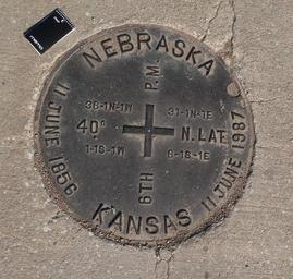 | Keywords: Survey monument JF00-072 disc marker 2.JPG en Survey monument JF00-072 located on Nebraska-Kansas state line at intersection of Nebraska counties Thayer and Jefferson and Kansas counties Washington and Republic; marking the intersection of 40 degrees north latitude and the Sixth Principal Meridian Metal disc manhole cover in center of intersection of county roads The black pocket notebook at upper left measures 3 by 5 inches 7 6 x 12 7 cm 2012-03-09 own Ammodramus cc-zero Uploaded with UploadWizard Pictures by Ammodramus Taken with Panasonic Lumix DMC-FZ20 Survey monument JF00-072 Kansas-Nebraska |