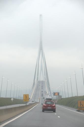 Keywords: suspension bridge architecture bridge distant fog normandy clouds road highway traffic