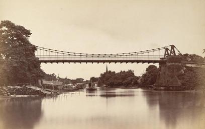 | Keywords: Suspension bridge at Dacca, erected in 1830.jpg en Photograph of Dacca Dhaka taken in the 1880s from an album 'Architectural Views of Dacca' containing 13 prints by Johnston and Hoffman Dhaka now the capital of Bangladesh became prominent in the 17th century as a provincial capital of the Mughal empire and was a major centre of trade particularly in fine muslins Its history though largely obscured is ancient and it was brought under Islamic rule by the 13th century first by the Delhi Sultanate then by the independent sultans of Bengal after which it was taken by the Mughals in 1608 In the 18th century Dhaka was eclipsed by Murshidabad under the Nawabs of Bengal and its population diminished As the fortunes of the Nawabs declined the power of the East India Company became a new factor Queen Victoria ™s Proclamation in 1858 brought all the territories held by the Company including Dhaka under British rule This view looking along the Buriganga river towards a suspension bridge with a church tower beyond 1880 http //www bl uk/onlinegallery/onlineex/apac/photocoll/s/019pho000001019u00004000 html Johnston and Hoffmann Custom license marker 2013 01 04 PD-Bangladesh Uploaded with UploadWizard Johnston and Hoffmann Old vintage photographs of Bangladesh Suspension bridges in Bangladesh |