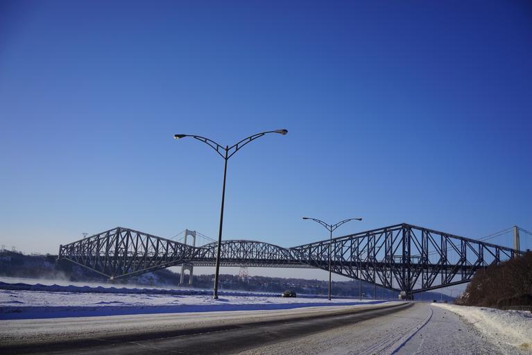 Keywords: suspension bridge bridge quebec winter st lawrence river ice cities steel