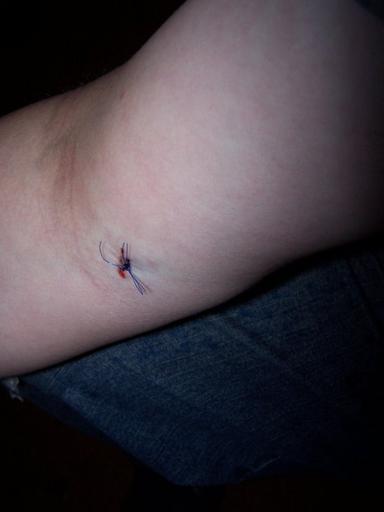 | Keywords: Suture - Landscaping Accident.jpg I received three stitches after I knelt down to spread bark and a kitchen knife that was in a pocket on my pants leg which I had been using to cut open bags of bark punctured my upper right arm nearly missing an artery and a bundle of nerves enwp 2007-12-21 en wikipedia Richardevan Surgical suture |