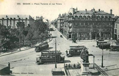 Keywords: Suzaine-Pierson 223 - SEDAN - Place Turenne et rue Thiers.JPG SEDAN Place Turenne et rue Thiers Collection personnelle Scanné par Claude_villetaneuse Carte oblitérée en 1909 pd-old Tramway de Sedan