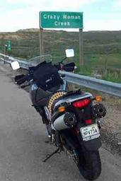 Keywords: SuzukiVstrom-CrazyWomanCreek.jpg Suzuki VStrom motorcycle in front of a Crazy Woman Creek sign in Wyoming USA 2005-10-04 own assumed TheJeffMiller~commonswiki Suzuki V-Strom