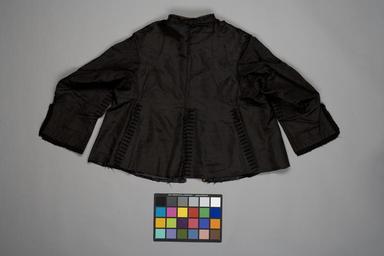 | Keywords: Svart tröja i sidenrips med foder i sidenmoiré - Livrustkammaren - 86714.tif LSH artwork sv Tillhört Karl X Gustav 1622-1660 Den stackota jackan har 6 skört d v s fram- och bakstyckena är hela och långa och endast i sidorna har man skarvat in ett svängt skörtstycke ovanför vilket ytterligare ett litet stycke sytts mellan framstyckets utdragna vinge ärmringningen och bakstycketssidosöm Jackan har knapphål hela vägen på vänster framkant d v s det finns 36 st ca 3cm långa knapphål varav de 12 nedersta inte kunnat användas då fodret på detta ställe gårut i kanten Samma antal knappar finns på högra sidan Knapparna är av trä överklädda medsvart tagel som bildar mönstret av en 6-uddig stjärna Stadkanten går fasten delvisbortklippt i framkanterna Ärmarna har sytts vardera av 2 stycken och de är öppna i denfrämre sömmen I den bakre sitter vid uppslagen 2 knapphål Endast en motsvarande knapp finns kvar på vänster ärm medan båda finns kvar på höger Utefter de öppna kanterna sitterpå understycket 21 knapphål 2 5 cm långa och sydda med svart högertvinnat silke 6stygn/cm Till dessa finns på vänster ärms överstycke 17 knappar i behåll och på höger 16st Men 4 knappar ser ut att saknas på båda ärmarna <br/>Vänster framstyckes bakre skörtkant har 19 3 cm långa knapphål och lika många knapparfinns på sidoskörtets främre del dock kan bara de 3 översta knäppas då fodret täcker påinsidan de övriga knapphålen På sidoskörtets bakre kant sitter 17 knappar svarande mot de17 knapphålen i bakstyckets främre sidokant Här kan också endast de 3 översta knäppas Mitt bak finns på vänster stycke 18 knappar till samma antal knapphål varav de 2 överstakan knäppas På den främre kanten av detta skört sitter 17 knapphål passande till likamånga knappar på högra sidostyckets kant de 3 översta kan knäppas På främre kanten avsidostycket sitter 19 knappar passande till samma antal knapphål i högra framstyckets bakresida varav de 2 översta kan knäppas Kragen är sydd av 2 snedskurna bitar av tyget som sytts ihop ungefär mitt bak Dess längdupptill är 51 cm nertill vid fastsyningen 53 cm Den är mitt fram 4 5 cm hög och har 2något mindre knappar av annan utformning än de övriga i plagget samt 2 tränsar av svartsilke Mitt bak är kragen knappt 3 5 cm hög I kragen ligger grov mörkbrun kanfas 13x12tr/cm2 som styvnad Jackan har på högra bakstycket en platt slät knapp placerad 1 5 cmfrån axelsömmen och 5 cm från kragsömmen Den är 1 5 cm i diameter och klädd med svart taft på trästomme Den har med största sannolikhet tjänat som fäste för kappbandet Jackan harett mellanfoder av grov grå linnelärft 16x16 tr/cm2 dock ej i ärmarna I dessa troligenmellanfoder endast nertill vid ärmuppslagen Dess innerfoder utgörs av svart moiré Vådbredden är minst ca 64 cm ty man kan ej härskönja spår av veck från moirébehandlingen Då vecket torde legat mitt i tyget har man häralltså klarat sig med mindre än den förmodade halva tygbredden ca 33 á 34 cm 40x26tr/cm2 Stad 0 6 cm 8 gula 4 röda 4 gula 4 röda 8 gula 1 svart tråd tuskaftsbindning Inga spår efter hängslen syns - märkligt nog - i jackan Detta kan beropå att dess foder som helhet är mycket defekt delvis söndersprättat och trasigt Jackan ärgarnerad med en 4 5 cm bred svart knypplad spets av lingarn i ett mycket smått ochhopträngt mönster Den sitter i 2 rader utefter den raka nederkanten - utan pie - påinsidan av ärmarna för att bilda de eleganta uppslagen Spetsen har sytts på så att den ihela uppslaget sidorna och nederkanten går i en veckad kant som når ca 2 cm utanförärmen Varje veck drar ca 3 ½ gång av materialet I själva den raka nederkantens del har man ovanför kantspetsen lagt en rad spets nu nästanslät blott en aning löst rynkad Beräknad spetsåtgång till en ärm ca 3 meter Ärmarna ärhopsydda så att överärmstycket lagts ovanpå underärmsstycket Innan ärmarna sytts i harärmhålen kantats med passpoal Mitt bak har höger stycke lagts på vänster och i sidorna harbakstyckena lagts på de främre Höger ärm hade lossnat helt men efter fotografering syttsfast 1955 original caption Svart tröja i sidenrips med foder i sidenmoiré LRK 19023<br/> Nyckelord Sidenrips Karl X Gustav Tröja Jacka 1600-tal Föremålsbild Dräkt - 1654 1660 silk Färg svart d1 - dräkt - yttermaterial material siden - silk Färg svart d2 - dräkt - foder material siden size mm 600 mitt fram size mm 580 mitt fram size mm 650 rygg mitt bak size mm 430 rygg size mm 340 skört fram size mm 320 skört sida size mm 290 skört bak size mm 150 axel size mm 590 ärm size mm 490 ärm size mm 395 ärm nedtill size mm 330 ärmslits från ärmhål och nedåt size mm 170 sprund i ärmens nedkant LRK Karl X Gustav av Sverige place of origin original filename lm_dig6516_19023 55558 inventory number LRK 19023 86714 CC-BY-SA Matti Östling <gallery caption Different images of same object > File Svart tröja i sidenrips med foder i sidenmoiré - Livrustkammaren - 86715 tif File Jacka av svart sidenrips - Livrustkammaren - 78654 tif </gallery> Matti Östling Charles X Gustav of Sweden Sweaters Jackets Clothing in Livrustkammaren Shirts Media contributed by LSH unmatched material Media contributed by LSH dim-with multiple size templates Media contributed by LSH unmatched keyword Color images from Livrustkammaren Media contributed by LSH 2013-10 |