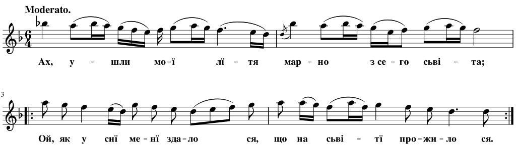 | Keywords: Об смертному часу.svg uk Ілюст ація до статті иколи Лисенка а одні музичні ст ументи на Вк аїнї оти на одної псальми Об сме тному часу 1894-04-27 Зо я часопис 1894 08 с 185-187 а одні; записано иколою Лисенком other versions Часопис Зо я 1894 08 pdf Hidden background ECECEC; white;color black border 1px grey solid; padding 2px Created by MuseScore <nowiki> < xml version 1 0 encoding UTF-8 > <museScore version 2 06 > <programVersion>2 0 2</programVersion> <programRevision>f51dc11</programRevision> <Score> <LayerTag id 0 tag default ></LayerTag> <currentLayer>0</currentLayer> <Synthesizer> </Synthesizer> <Division>480</Division> <Style> <lastSystemFillLimit>0</lastSystemFillLimit> <TextStyle> <halign>center</halign> <valign>baseline</valign> <xoffset>0</xoffset> <yoffset>6</yoffset> <offsetType>spatium</offsetType> <name>Lyrics Odd Lines</name> <family>FreeSerif</family> <size>11</size> <bold>1</bold> <sizeIsSpatiumDependent>1</sizeIsSpatiumDependent> </TextStyle> <page-layout> <page-height>368 504</page-height> <page-width>1190 55</page-width> <page-margins type even > <left-margin>5 66929</left-margin> <right-margin>5 66929</right-margin> <top-margin>56 6929</top-margin> <bottom-margin>113 386</bottom-margin> </page-margins> <page-margins type odd > <left-margin>5 66929</left-margin> <right-margin>5 66929</right-margin> <top-margin>0</top-margin> <bottom-margin>0</bottom-margin> </page-margins> </page-layout> <Spatium>1 764</Spatium> </Style> <showInvisible>1</showInvisible> <showUnprintable>1</showUnprintable> <showFrames>1</showFrames> <showMargins>0</showMargins> <metaTag name arranger ></metaTag> <metaTag name composer ></metaTag> <metaTag name copyright ></metaTag> <metaTag name creationDate >2015-11-28</metaTag> <metaTag name lyricist ></metaTag> <metaTag name movementNumber ></metaTag> <metaTag name movementTitle ></metaTag> <metaTag name platform >Microsoft Windows</metaTag> <metaTag name poet ></metaTag> <metaTag name source ></metaTag> <metaTag name translator ></metaTag> <metaTag name workNumber ></metaTag> <metaTag name workTitle ></metaTag> <PageList> <Page> <System> </System> <System> </System> </Page> </PageList> <Part> <Staff id 1 > <StaffType group pitched > <name>stdNormal</name> </StaffType> </Staff> <trackName>Violin</trackName> <Instrument> <longName>Violin</longName> <shortName>Vln </shortName> <trackName>Violin</trackName> <minPitchP>55</minPitchP> <maxPitchP>103</maxPitchP> <minPitchA>55</minPitchA> <maxPitchA>88</maxPitchA> <instrumentId>strings violin</instrumentId> <Articulation> <velocity>100</velocity> <gateTime>100</gateTime> </Articulation> <Articulation name staccatissimo > <velocity>100</velocity> <gateTime>33</gateTime> </Articulation> <Articulation name staccato > <velocity>100</velocity> <gateTime>50</gateTime> </Articulation> <Articulation name portato > <velocity>100</velocity> <gateTime>67</gateTime> </Articulation> <Articulation name tenuto > <velocity>100</velocity> <gateTime>100</gateTime> </Articulation> <Articulation name marcato > <velocity>120</velocity> <gateTime>67</gateTime> </Articulation> <Articulation name sforzato > <velocity>120</velocity> <gateTime>100</gateTime> </Articulation> <Channel> <program value 40 /> <synti>Fluid</synti> </Channel> <Channel name pizzicato > <program value 45 /> <synti>Fluid</synti> </Channel> <Channel name tremolo > <program value 44 /> <synti>Fluid</synti> </Channel> </Instrument> </Part> <Staff id 1 > <Measure number 1 > <KeySig> <accidental>-1</accidental> </KeySig> <TimeSig> <sigN>6</sigN> <sigD>4</sigD> <showCourtesySig>1</showCourtesySig> </TimeSig> <Tempo> <tempo>1 83333</tempo> <text>Moderato </text> </Tempo> <Chord> <durationType>quarter</durationType> <Lyrics> <text>Ах </text> </Lyrics> <Note> <Accidental> <role>1</role> <subtype>flat</subtype> </Accidental> <pitch>82</pitch> <tpc>12</tpc> </Note> </Chord> <Slur id 2 > <track>0</track> <SlurSegment no 0 > <o4 x 0 449972 y 0 149991 /> </SlurSegment> </Slur> <Chord> <durationType>eighth</durationType> <Lyrics> <syllabic>begin</syllabic> <text>у</text> </Lyrics> <Slur type start id 2 /> <Note> <pitch>81</pitch> <tpc>17</tpc> </Note> </Chord> <Chord> <durationType>16th</durationType> <Note> <pitch>82</pitch> <tpc>12</tpc> </Note> </Chord> <Chord> <durationType>16th</durationType> <Slur type stop id 2 /> <Note> <pitch>81</pitch> <tpc>17</tpc> </Note> </Chord> <Slur id 3 > <track>0</track> <SlurSegment no 0 > <o4 x 0 299981 y 0 149991 /> </SlurSegment> </Slur> <Chord> <BeamMode>begin</BeamMode> <durationType>16th</durationType> <Lyrics> <syllabic>end</syllabic> <text>шли</text> </Lyrics> <Slur type start id 3 /> <Note> <pitch>79</pitch> <tpc>15</tpc> </Note> </Chord> <Chord> <durationType>16th</durationType> <Note> <pitch>77</pitch> <tpc>13</tpc> </Note> </Chord> <Chord> <durationType>16th</durationType> <Slur type stop id 3 /> <Note> <pitch>76</pitch> <tpc>18</tpc> </Note> </Chord> <Chord> <BeamMode>no</BeamMode> <durationType>16th</durationType> <Lyrics> <syllabic>begin</syllabic> <text>мо</text> </Lyrics> <Note> <pitch>77</pitch> <tpc>13</tpc> </Note> </Chord> <Slur id 4 > <track>0</track> <SlurSegment no 0 > <o4 x 0 149991 y -0 449972 /> </SlurSegment> </Slur> <Chord> <durationType>eighth</durationType> <Lyrics> <syllabic>end</syllabic> <text>ї</text> </Lyrics> <Slur type start id 4 /> <Note> <pitch>79</pitch> <tpc>15</tpc> </Note> </Chord> <Chord> <durationType>16th</durationType> <Note> <pitch>81</pitch> <tpc>17</tpc> </Note> </Chord> <Chord> <durationType>16th</durationType> <Slur type stop id 4 /> <Note> <pitch>79</pitch> <tpc>15</tpc> </Note> </Chord> <Slur id 5 > <track>0</track> </Slur> <Chord> <dots>1</dots> <durationType>quarter</durationType> <Lyrics> <syllabic>begin</syllabic> <text>лї</text> </Lyrics> <Slur type start id 5 /> <Note> <pitch>77</pitch> <tpc>13</tpc> </N