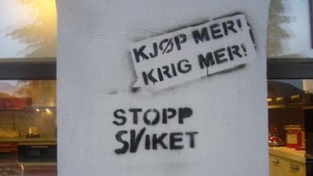 Keywords: SVkontoret.jpg en Text that says stop the treason sv Stoppa SVeket own Hedman Maoism Communism in Norway Sosialistisk Venstreparti Norwegian language Graffiti in Norway Communism graffiti