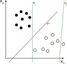 Keywords: Svm separating hyperplanes.png Graphic showing 3 Hyperplanes in 2D H3 doesn't separate the 2 classes H1 does with a small margin and H2 with the maximum margin Own 2008-02-16 Cyc Svm separating hyperplanes SVG svg Support vector machine