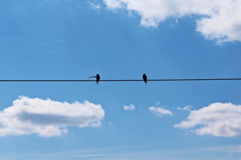 Keywords: swallows pair sky blue clouds fly mood birds nature freedom animal atmospheric background beautiful atmosphere wing bird couple black feather plumage agriculture power line