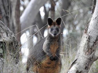 Keywords: swamp wallaby kangaroo standing looking trees wildlife marsupial nature australia portrait mammal