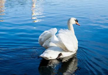 Keywords: swan bird water pond swim beautiful white graceful nature animal bill wing lake wild elegant plumage romantic love summer light sun luck sunshine happy joy blue