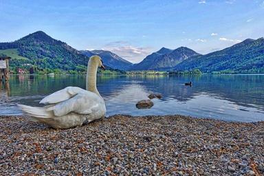 Keywords: swan lakeside mountains view nature lake water landscape cygnus tranquil graceful bird