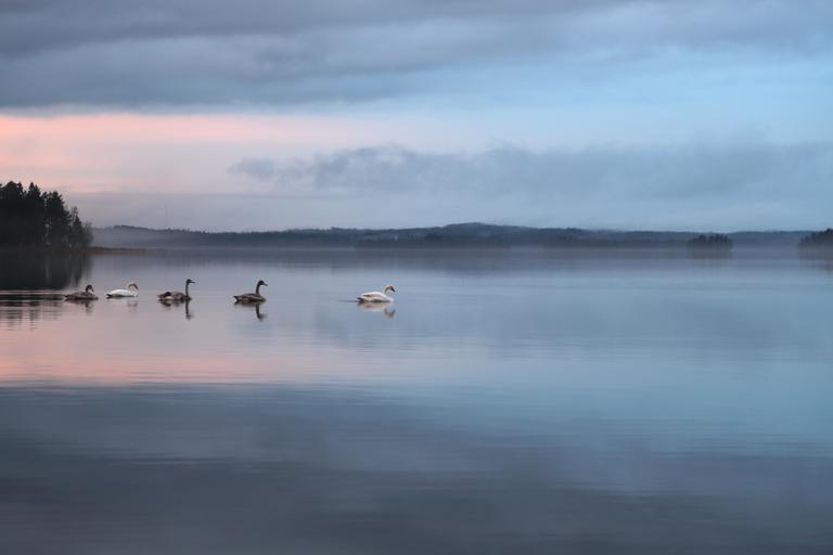 Keywords: swan nature peace autumn finnish summer house cottage scenic lake in the evening countryside beach water fog calm evening twilight clouds sky beach cottage silence happiness clean bird november family the proximity of