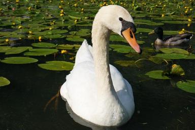 Keywords: swan swimming water bird white lake wildlife nature portrait peaceful graceful elegance tranquil flowers lily pads