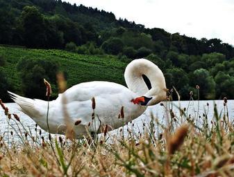 Keywords: swan water swans grass lake nature animal landscape bird clouds neck branches green