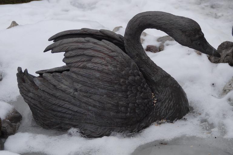 Keywords: swan winter cold snow icy black black swan metal sculpture animal bird