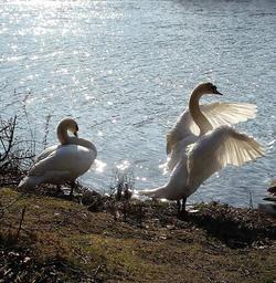 Keywords: swans couple swimming birds danish denmark national bird white water natural spring nice