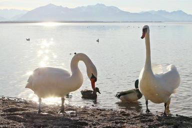 Keywords: swans nature lake waters swan back light sparkle water standing
