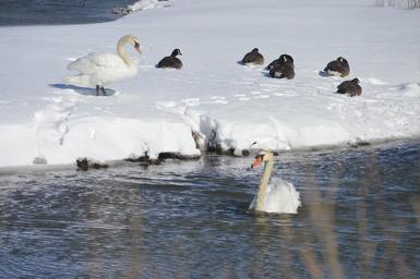 Keywords: swans snow stream nature winter bird white wildlife feather water