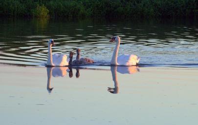 Keywords: swans swan young swans gray white young wild birds nature water birds water bird chicks relief channel evening reflection animal river