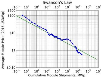 | Keywords: Swansons-law.svg translate yes en The green line shows Swanson's law a 20 decrease in price for every doubling of cumulative shipped photovoltaics The blue line shows actual world wide module shipments vs average module price from 1976 104/Wp to 2015 0 58/Wp Prices are in 2015 dollars The actual decrease has been slightly greater than a 20 decrease with each doubling Data is from Figure 46 http //www itrpv net/Reports/Downloads/2016/ ITRPV Edition 2016 compare to current spot-market prices http //pv energytrend com/pricequotes html here own Delphi234 2015-05-22 <table><tr><td>thumb German</td><td>thumb English</td><td>thumb French</td></tr><tr><td>thumb Japanese</td><td>thumb Polish</td><td>thumb Chinese</td></tr></table> Cc-zero Photovoltaics Learning curve |