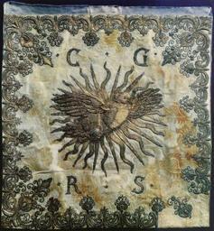 | Keywords: Sweden Standard of Charles X Gustav.jpg Sweden ca 1654 silver damask cm 48 49 2 Institution Wawel Royal Castle Crown Treasury accession number object history ca 1654 commission Charles X Gustav ProvenanceEvent 1656-03-27 transfer Stefan Czarniecki ProvenanceEvent 1665 inheritance Aleksandra Brancka née Czarniecka mid other date century 18 inheritance Potocki family RoÅ› ProvenanceEvent 1883 transfer Stefan Potocki ProvenanceEvent 1933 transfer Tarnowski family Rudnik ProvenanceEvent 1957 bequest Wawel Castle Kraków Zofia Tarnowska and StanisÅ‚aw Tarnowski credit line ¢ C ¢ G ¢ R ¢ S ¢ Carolus Gustavus Rex Sueciae caption la Czarniecki troops under command of Captain Szandarowski surprised the Swedish king in the morning when sitting down to table at the presbytery of the village of Kopki near Rudnik The king managed to escape thanks to a swift horse Italian damask was adorned with the symbol of the Holy Spirit and a border of double scrolls and palmettes Magdalena Piwocka 2002-2003 Proporzec Karola X Gustawa w zbiorach Zamku Królewskiego na Wawelu in Studia Waweliana Vol 11/12 Pic X p 168-169 See below PD-old-100 DEFAULTSORT 1654 circa; Standard of Charles X Gustav Crown Treasury of the Wawel Castle Historical royal standards of Sweden 17th-century textiles Charles X Gustav of Sweden Memorabilia of Stefan Czarniecki Holy Spirit depicted as a dove |