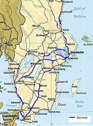 | Keywords: Swedish highspeed rail map 2008 by BIL.png Map of Swedish railway lines having 200 km/h as maximum speed also being used self-made map Information source obtained by BIL 1 Info about which lines have 200 km/h from personal travel experience time tables websites such as www jarnvag net especially about which trains are used where 2 Measurement of curve radii using http //www2 lantmateriet se/ksos/index html X2000 tilting needs 2000 m as radius for 200 km/h 3 User Tydal has adjusted it slightly based on internal Banverket documentations <br>The map can be modified to reflect errors based on sitiuation late 2008 Please do not modify include to speed upgrades made after 2008 There is a Image Swedish highspeed rail map 2010 by BIL png for the situation late 2010 2008-05-10 and modified until 12 Jul 2009 BIL and Tydal Public Domain Swedish highspeed rail map 2010 png Data has been reused for File Sweden railways png Rail transport maps of Sweden |
