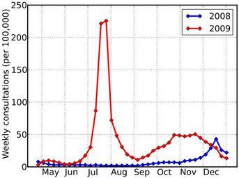 | Keywords: Swineflu uk rate.svg en Weekly consultation rate for influenza-like illness in the UK Graph is own work by uploader numerical data from documents at HPA which sourced data from QResearch Dave Farrance 2010-01-15 Source Figures for 2009 flu sourced from documents at HPA Weekly epidemiological updates archive http //www hpa org uk/webw/HPAweb HPAwebStandard/HPAweb_C/1244442494458 and figures for 2008 flu estimated from inspection of Fig 2 at web-page for HPA's Weekly pandemic flu update for 16th July 2009 http //www hpa org uk/web/HPAweb HPAwebStandard/HPAweb_C/1247728933406 This graph was created with the following Python/Matplotlib script <source lang python > /usr/bin/env python from pylab import flu08 8 6 4 3 3 3 3 3 3 3 2 3 2 2 2 2 2 2 2 2 3 4 5 6 7 7 7 6 9 10 11 14 19 29 43 26 22 flu09 3 1 8 4 9 8 8 6 6 5 4 2 4 4 5 8 8 9 17 4 30 4 86 8 221 4 225 7 72 2 48 3 30 8 19 3 14 4 10 9 14 5 17 3 25 0 29 6 32 0 37 4 49 2 48 5 47 2 48 4 50 5 44 9 38 6 33 8 29 3 16 4 13 3 rc 'axes' lw 2 0 plot range 17 17+len flu08 flu08 'bD-' lw 3 0 label '2008' plot range 17 17+len flu09 flu09 'rD-' lw 3 0 label '2009' xticks array range 0 9 4 4+17 7 'May' 'Jun' 'Jul' 'Aug' 'Sep' 'Oct' 'Nov' 'Dec' size 18 ha 'left' yticks size 18 grid lw 0 75 ylabel 'Weekly consultations per 100 000 ' size 18 rc 'legend' fontsize 18 ; legend savefig 'sf-qs svg' </source> I release the graph and its source script to the public domain -- but note that the numerical data that was used to create this graph was sourced from press release documents on the HPA website which sourced data from QResearch but I could find no statement of rights to that numerical data either in the documents or on the website Influenza Epidemics 2009 swine flu outbreak in the United Kingdom 2009 swine flu outbreak graphs Pandemic |