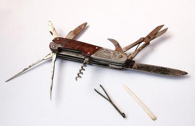 | Keywords: Swiss army similar knife(side).jpg 'swiss army'-look knife with similar functionality Made in Russia in about 1980-s in Nizhniy Novgorod Includes large blade small blade scissors can opener scredriver awl file corkscrew tweezers and toothpick About 80mm length It's used very often so saved not so good Own 2007-08-13 Krr Multi-tool_knives Corkscrew tool - Swiss-knife |