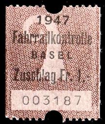 | Keywords: Switzerland Basel 1947 bicycle control revenue 1fr - 4.jpg en Switzerland Basel 1947 bicycle control revenue 1fr - 4 Perforated 14 5 horizontally 1947 own scan Government of Basel other versions Custom license marker 2017 01 01 PD-old Revenue stamps of Switzerland Bicycle revenue stamps 1947 stamps of Basel |