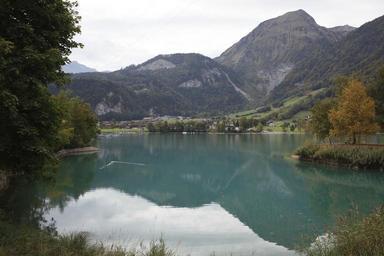 Keywords: switzerland rungan lake reflection mountain green autumn autumnal leaves water chalet