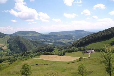 Keywords: switzerland sky clouds mountains valley ravine nature outside fields grass plants forest trees woods scenic vista summer spring house home