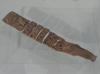 | Keywords: Sword sheath (gold, Western Han) - Yunnan Provincial Museum - DSC02238.JPG Exhibit in the Yunnan Provincial Museum Kunming Yunnan China I took this photograph 2011-08-09 00 57 45 Daderot Public domain Antiquities in the Yunnan Provincial Museum |