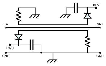 | Keywords: SWR Meter.svg SWR meter <br> TX is the input from the transmitter ANT is the antenna connection FWD is the forward wave connection REV is the reflected wave connection GND is the external ground connection own Inductiveload 2009-01-25 SWR meters |
