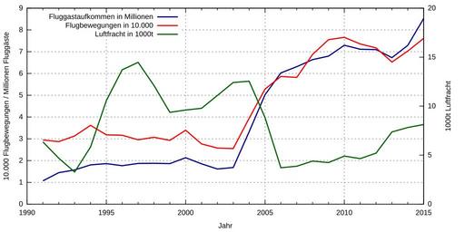 | Keywords: SXF stats.svg en Berlin Schönefeld Airport statistical data de Flughafen Berlin-Schönefeld Verkehrszahlen seit 1991 own ; data from http //www berlin-airport de/DE/UeberUns/Verkehrsstatistik/Monatlich/SXF berlin-airport de Gorgo 2011-02-13 Gnuplot script to generate this plot gnuplot <source lang gnuplot > /usr/bin/gnuplot gnuplot 4 2 / Ubuntu 8 10 input set timefmt Y set datafile separator ; output set key top left set style data lines set grid set xdata time set xlabel 'Jahr' set xrange '1990' '2015' set xtics 157680000 set mxtics 5 set format x ' Y' set ylabel '10 000 Flugbewegungen / Millionen Fluggäste' set ytics nomirror set ytics 1 set yrange 0 9 set y2tics 5 set autoscale y2 set y2range 0 20 set y2label '1000t Luftfracht' set term svg size 800 400 font Arial 10 set output 'SXF_stats svg' plot '-' using 1 2/1000000 title 'Fluggastaufkommen in Millionen' axes x1y1 lt rgb 'dark-blue' lw 2 \ '-' using 1 2/10000 title 'Flugbewegungen in 10 000' axes x1y1 lt rgb 'red' lw 2 \ '-' using 1 2/1000 title 'Luftfracht in 1000t' axes x1y2 lt rgb 'dark-green' lw 2 1991;1069886 1992;1446933 1993;1572361 1994;1804490 1995;1861674 1996;1766452 1997;1870213 1998;1876209 1999;1861385 2000;2133919 2001;1851377 2002;1615171 2003;1684384 2004;3325348 2005;5026115 2006;6026228 2007;6313343 2008;6638162 2009;6797158 2010;7297911 2011;7113989 2012;7097274 2013;6727306 2014;7292517 2015;8526268 e 1991;29472 1992;28723 1993;31334 1994;36185 1995;31827 1996;31649 1997;29563 1998;30711 1999;29304 2000;33947 2001;27635 2002;25755 2003;25549 2004;39420 2005;52852 2006;58647 2007;58198 2008;68771 2009;75538 2010;76595 2011;73577 2012;71758 2013;65268 2014;70325 2015;76153 e 1991;6349 1992;4686 1993;3284 1994;5823 1995;10573 1996;13716 1997;14473 1998;12111 1999;9372 2000;9604 2001;9785 2002;11099 2003;12418 2004;12546 2005;8833 2006;3720 2007;3870 2008;4399 2009;4246 2010;4907 2011;4649 2012;5206 2013;7370 2014;7827 2015;8128 e </source> Cc-zero Berlin Schönefeld Airport Images with Gnuplot source code Airport statistics |
